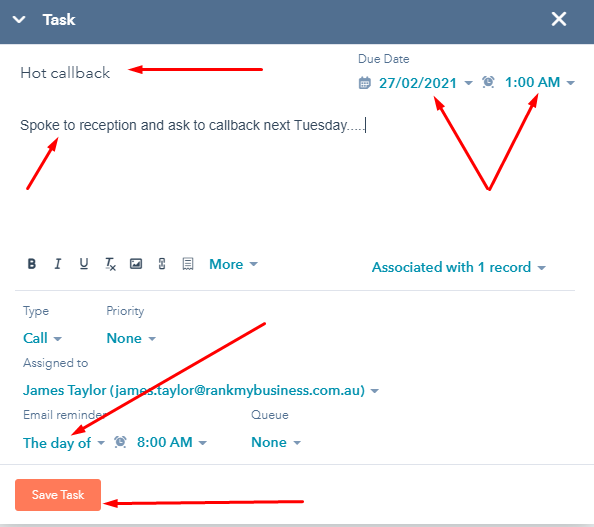 Always choose “The day of” at bottom so you will receive email reminder to callback